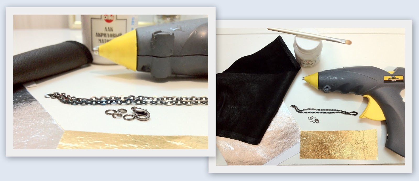 Расходные материалы: небольшой кусок кожи и замши ( у меня была замша, обратная сторона была кожаная с отличной выделкой), цепочка, 4 кольца, карабин, золотая и серебряная поталь кисточка, клей (фольгу, клей и кисточку можно заменить на кусочки позолоченной и посеребренной готовой кожи), ножницы, ручка для рисования по коже (у меня был тонкий белый корректор), клеевой пистолет. Средние затраты времени - 30-40 минут.